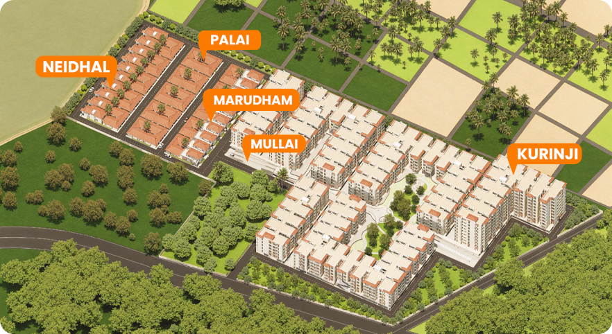 Drawing inspiration from the five traditional landforms mentioned in the ancient Tamil text “Tolkappiyam” – Kurinji, Mullai, Marutham, Neithal, and Palai. Each landform translates into a distinct architectural element catering to the specific needs and preferences of senior citizens.